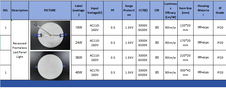 9/24/36W įleidžiamas berėmio DOB skydelio apšvietimas, lygintuvas+pp